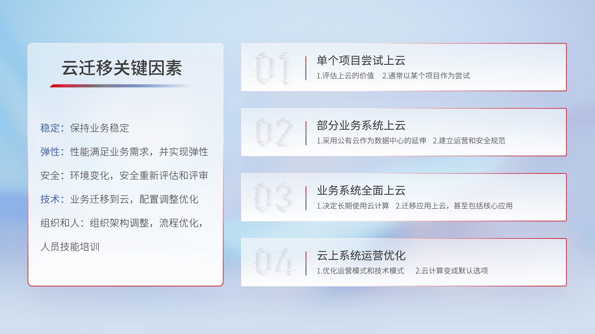 结合实际业务,,,从规划设计、、、云平台选型、、云原生改造、、、数据迁移、、、集成交付,,,,迁移全过程为客户识别最佳上云路径,,做好风险识别管理,,,,设计网络架构、、、身份权限、、安全审计合规、、操作审计、、、、日志审计、、监控告警策略、、、、多站点容灾设计等,,,,对云上基础设施进行整体规划,,提升IT治理水平,,,以满足弹性、、、高可用、、高性能的需求。。