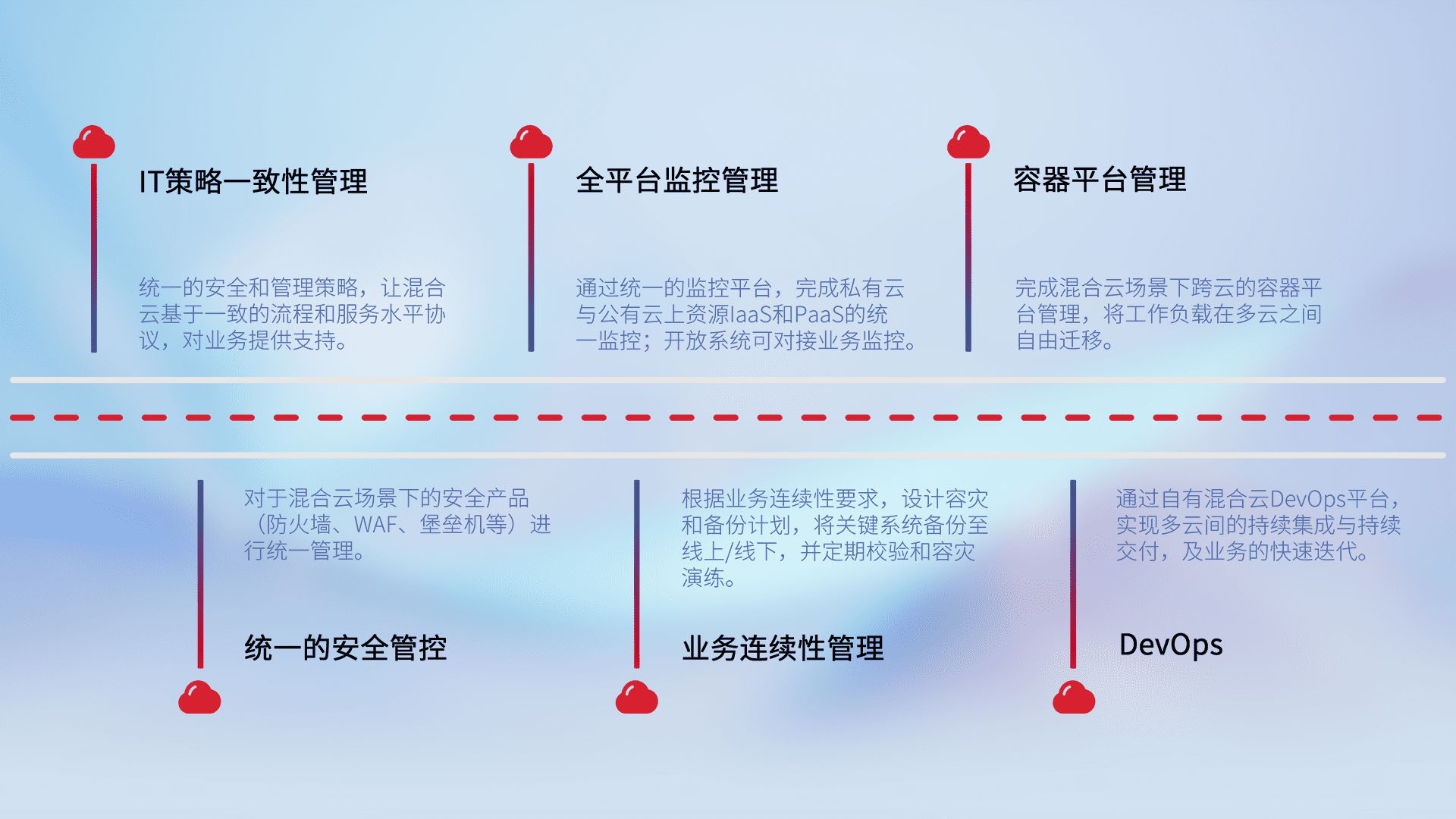 通过多云纳管,,,,以统一的资源数据模型把客户的云资源进行抽象和封装,,进而实现对多云资源的统一操作,,,保障云资源管理的可靠性、、、、稳定性与可用性。。。。量身定制化运维内容,,配置、、、、开发运维、、、补丁管理、、、备份、、监控、、、、认证和访问管理、、审计和日常巡检等,,,保障在用云过程中的可靠度,,稳定度以及高可用率。。
